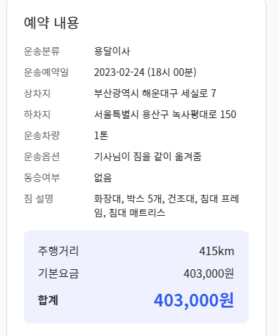 예약시간에 따라서도 요금이 달라지는 점 참고 하시기 바랍니다. 오후 6시 예약으로 부산에서 서울 용산구까지 기사님이 짐을 옮겨주시고 동승은 하지 않은 요금입니다. 주행거리 415KM에 기본요금 403,000원이 나왔습니다. 동승 서비스를 요청한다면 약 4만원정도의 추가 요금이 붙습니다. 만약 선택 옵션란에 본인의 이사 상황에 맞는 항목이 없다면 센디측에 전화해 상담원과 이야기를 통해 정확한 견적을 받을 수 있습니다.